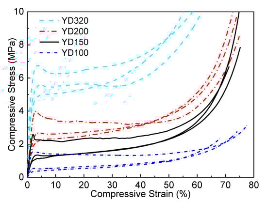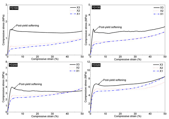 Compression stress–strain curves of YD100, YD150, YD200, and YD320 PET foam samples in X1, X2, and X3 directions. Highest performance is X3 direction; lowest performance is X1 direction.