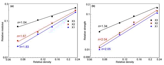 The power law fits the experimental relative modulus and experimental relative strength as a function of relative density in three directions using Equations (5) and (6): (a) relative modulus vs. relative density; (b) relative strength vs. relative density.