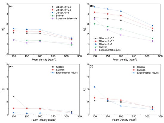 Experimental strength and modulus anisotropy vs. model predictions obtained by Gibson’ model, Equations (7) and (8), and Sullivan’s model, Equations (9) and (10): (a) modulus anisotropy of X2X1plane; (b) modulus anisotropy of X3X1plane; (c) strength anisotropy of X2X1 plane; and (d) strength anisotropy of X3X1 plane.