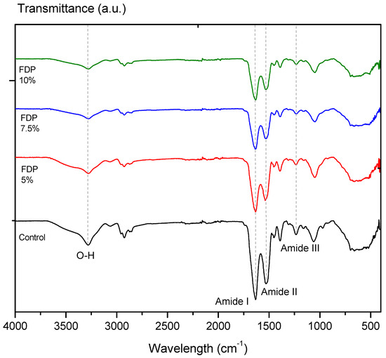 Infrared spectra by Fourier transform of additives in powders: Control: freeze-dried chick-pea protein; FDP 5%: freeze-dried powder additive with 7.5% chickpea protein; FDP 7.5%: freeze-dried powder additive with 7.5% chickpea protein; FDP 10%: freeze-dried powder additive with 10% chickpea protein.