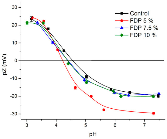 As expected, the control exhibits an isoelectric point (IEP) value of 4.55, similar to the 4.5 reported by Soto-Madrid et al. [25], while FDP 7.55% and 10% display consistent IEP at 4.45 with similar behavior. However, FDP 5% exhibits a slightly lower IEP of 4.3. All values agree with Vani and Zayas. [50], Boye et al. [51], and Ma et al. [52]; the authors indicate that most plant proteins have an IP between 4.0 and 5.0. It is important to note that proteins could adsorb charges on their surfaces at their IEP due to the presence of other compounds, such as polyphenols [53]. In this case, the diminution of IEP in the FDP 5% sample can be attributed to negative charges from free phenolic compounds, independent of the total neutral charge at IEP.