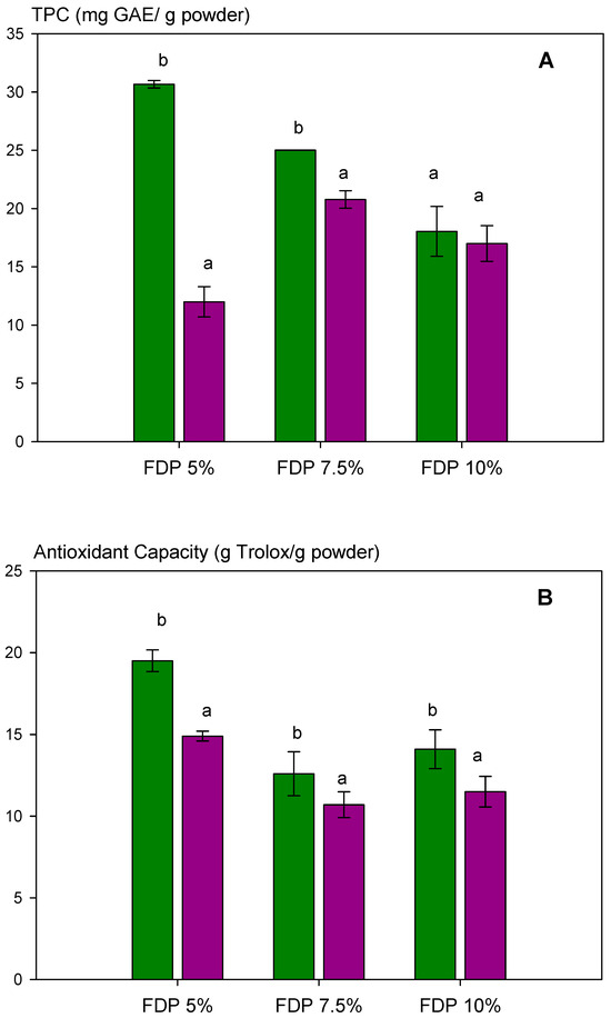 Analysis of the stability of the total polyphenol content and antioxidant activity of powder additives at different relative humidities (RH): (A) total polyphenol content (TPC); (B) antioxidant capacity of the powders quantified by DPPH radical scavenging activity. Green bars indicate relative humidity 33%, and violet bars indicate a relative humidity 75%. FDP = freeze-drying powder at different chickpea protein concentrations in % w/v. GAE = gallic acid equivalent. Different letters (a,b) indicate significant differences (p < 0.05) between samples.