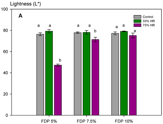 Stability of the additive powders for the lightness parameter (L*) at different relative humidities (RH) and protein concentrations (%). (A) Graph of the analysis of the L* parameter for powder additives. (B) Images of the powder additives: control, 33, and 75% RH. Green bars indicate relative humidity 33%, and violet bars indicate a relative humidity 75%. FDP = freeze-drying powder at different chickpea protein concentrations in % w/v. Different letters (a,b) indicate significant differences (p < 0.05) between samples.