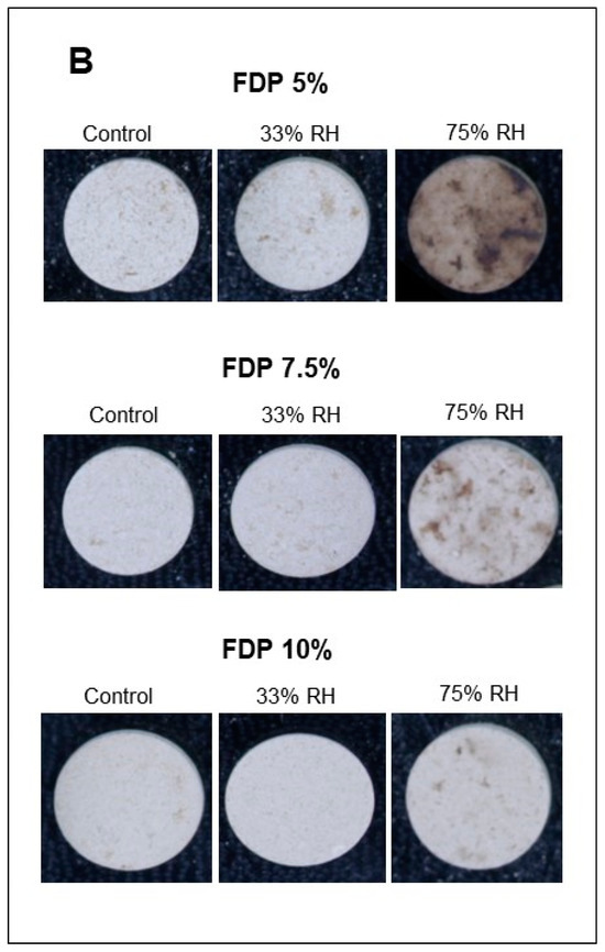 The effect of two relative humidities (33 and 75% RH) on antioxidant capacity via DPPH and total polyphenol content, TPC, was analyzed in powder additives. The results are shown in Figure 4A (TPC) and Figure 4B (antioxidant capacity). Relative humidity affected TPC, decreasing significantly at 75% RH, dependent on protein concentration (Figure 4A). For the FDP 5% sample, a 60% diminution of TPC was observed; meanwhile, at 7.5%, it was 17%. However, relative humidity did not significantly affect (p > 0.05) the TPC when the protein concentration was 10%. This demonstrated the importance of protein concentration in protecting the antioxidant compounds from humidity during storage. The same behavior was observed for antioxidant capacity (Figure 4B).