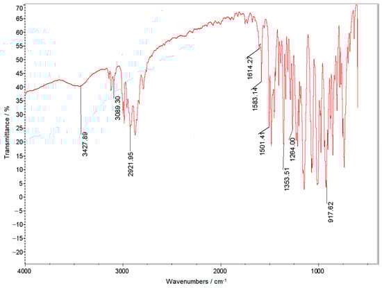 As shown in Figure 2, which represents the FT-IR of GFZ, a characteristic peak in the oxazine ring appears at 917.62 cm−1 (the similar structure of oxazine composite can be seen in Figure A1, Appendix A), and there is no hydroxyl stretching vibration absorption peak near 3427 cm−1, indicating that the phenolic hydroxyl group has been fully reacted.