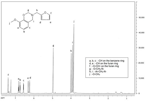 Figure 5 shows the 1H-NMR spectrum of GFZ, and each proton peak in the figure can be identified via the chemical shift (the original spectrum with detailed data can be found in Figure A2, Appendix A). The peak at 6.756–6.853 ppm (a,b,c) can be attributed to the proton peak on the benzene ring; the peak at 6.245–6.325 ppm (d,e) can be attributed to the proton peak of -CH on the furan ring; the peak at 7.408 ppm (f) can be attributed to the proton peak of -O-CH= on the furan ring; the peak at 4.987 ppm (g) can be attributed to the proton peak of -O-CH2-N-; the peak at 3.948–4.016 ppm (h,i) can be attributed to the proton peak of -Ar-CH2-N-; and the peak at 3.885 ppm (j) can be attributed to the proton peak of -O-CH3. The area ratio of each peak, a:b:c:d:e:f:g:h:i:j, is equal to 1.099:1.023:1.000:1.001:1.024:1.003:2.103:2.189:2.155:3.113, and the theoretical ratio of proton numbers, a:b:c:d:e:f:g:h:i:j, is equal to 1:1:1:1:1:1:2:2:2:3.
