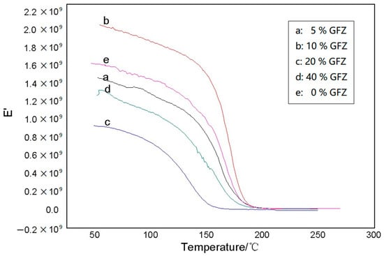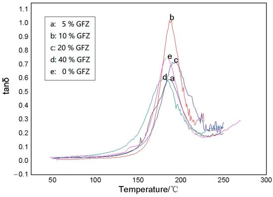 Figure 9 shows the relationship between temperature and the storage modulus of GFZ/BAZ copolymer spline samples with different ratios. When GFZ content reaches 10%, the storage modulus of the copolymer greatly improves, which means that the strength of the material is greatly enhanced. When the content of GFZ continuously increases, the storage modulus decreases again. The GFZ and BAZ prepared in this paper are both small molecule complexes with oxazine rings and π-π conjugated structures. Due to the similarities in the molecular structures of these two complexes, the two resins also have good compatibility. During the copolymerization process of GFZ and BAZ, the oxazine ring in GFZ opens and enters the cross-linking network, while the oxazine ring and furan ring in BAZ also participate in the curing process, then enter the cross-linking network, making it easy for the two to blend and solidify. Meanwhile, the long carbon chains contained in GFZ molecules increase the flexibility of the molecular chains while also reducing the crosslinking density, which results in a decrease in the rigidity of the crosslinking network and a decrease in the storage modulus.
