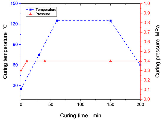 Thermoplastic composite laminates are manufactured in four steps using the hot compression moulding process. In the first step, the prepreg is cut to the size of the large sheet, and the cut prepreg is laid out according to the design angle of the lay-up and spot welded layer by layer. Before moulding, a mould release agent should be used to treat the mould to avoid difficulty in mould release. In the second step, after the film is closed, a pre-pressure of 0.01 MPa is first applied to expel the gas between the layers, and the hot press is divided into three processes to increase the temperature to 385 °C. Then, the pressure is increased to 1.2 MPa, and the insulation is kept at a constant pressure for 30 min to make the resin and fibers form a good adhesion with each other (see Figure 1 for the curve of the hot pressing process). The third step is to cool the large plate to room temperature at a cooling rate of 3 °C/min, and keep the pressure constant during the cooling process. The fourth step is to cut the board into test pieces according to size, and a test indicator is used during the cutting process to ensure that the accumulation of fiber direction error does not exceed 2°. In addition, a water-cooled diamond tool is used to cut the test pieces to avoid overheating and carbonization of the substrate during the cutting process.