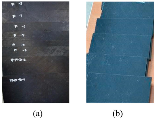 The present specimens are two kinds of fiber stacking sequences, which are seen in Table 4. The specimens of TP and TS composite laminates are shown in Figure 3a,b.