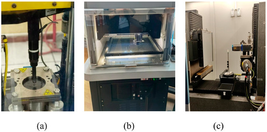 All test devices are shown in Figure 4. According to ASTM D7136 [41], the drop-weigh impact test is carried out by using an electric mechanism to lift the impactor. During the impact, the specimen is supported by a base plate with a circular hole in the center and immobilized with clamps. A hemispherical steel impactor with a diameter of 12.7 mm is used for the impact test. The total mass of the punch and counterweight is 7.26 kg. The impact energy includes three levels: E1 = 6.67 J/mm, E2 = 5.56 J/mm, and E3 = 4.45 J/mm. The specimens are measured by an indentation depth gauge when placed for 48 h after impact. Firstly, the overall damage range of the specimen is determined using a C-scan. Then, based on the results of the C-scan analysis, CT technology is used to analyze the damage types and damage mechanisms, and the effects of stacking sequence and material properties on impact damage are discussed. All of the equipment used in the test is shown in Table 5.