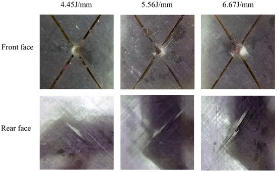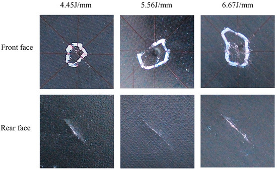 For TP and TS composites, the damage morphology after impact is shown in Figure 5 and Figure 6. It is concluded that the damage that forms on the front surface and the back surface are similar, including the fiber fracture, matrix cracks, and delamination. There is clearly an impact bulge on the back surface and an impact dent on the front surface of specimens. The main reason for the damage is the tension stress and shear stress caused by the bending deformation of the laminate, especially in the lowest plies of the laminate. The tensile stress is perpendicular to the fiber direction in the lowest layer, and is completely transmitted by the matrix, which leads to matrix cracking, the separation between fiber bundles, and the phenomenon of matrix fracture, fiber fracture, and large-scale delamination parallel to the fiber direction.