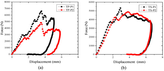 Impact force–displacement curve under 6.67 J/mm. (a) TP composite; (b) TS composite.