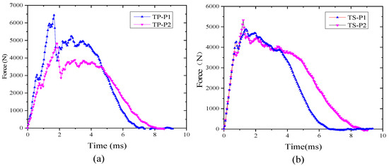 Impact force–time curve under 6.67 J/mm: (a) TP composite; (b) TS composite.