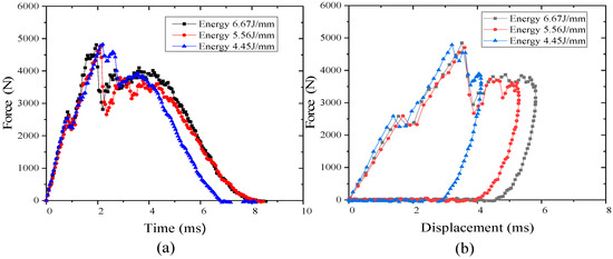 Figure 9a shows impact force–time curves under different impact energies (6.67 J/mm, 5.56 J/mm, 4.45 J/mm) when the TP composites are under the P2 scheme. It can be concluded that F1 is basically the same under different impact energies, at about 2650 N. The slope of the impact force–time curve is also basically the same before F1 appears. Figure 9b shows the impact force–displacement curve under different impact energies when the TP composites are under the P2 scheme. With the increase of impact energy, the maximum displacement of the laminate increases continuously, which means the corresponding strain energy increases, and the damage of the laminate becomes more serious.