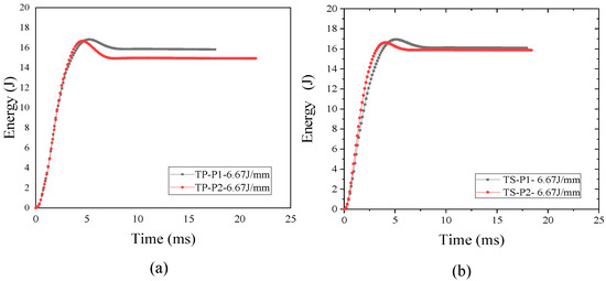 Impact energy–time curve under 6.67 J/mm. (a) TP composite; (b) TS composite.