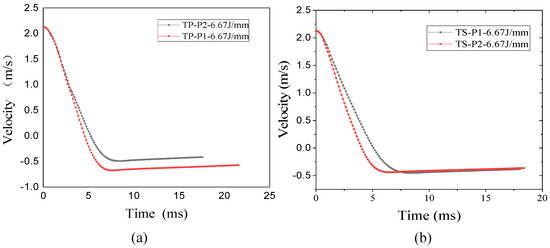 Velocity–time curve under 6.67 J/mm. (a) TP composite; (b) TS composite.