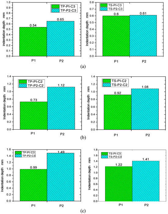 The comparison of indentation depth under different impact energies. (a) 4.45 J/mm impact energy; (b) 5.56 J/mm impact energy; (c) 6.67 J/mm impact energy.