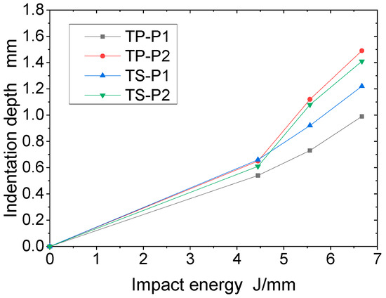 Figure 12 and Figure 13 show the indentation depth of the thermoplastic composite and thermoset composite for different ply stacking sequences at 4.45 J/mm, 5.56 J/mm, and 6.67 J/mm, respectively. Figure 11 shows the variation of impact energy versus indentation depth for TP and TS for different ply stacking sequences. The indentation depth of the thermoplastic composite is reduced by 10%, 20.7%, and 18.9% for P1 ply compared to the thermoset composite at an impact energy of 4.45 J/mm, 5.56 J/mm, and 6.67 J/mm, respectively, while the damage area of the thermoplastic composite is reduced by 6.6%, 3.7%, and 5.7%, respectively, compared to the thermoset composite for P2 ply. At an impact energy of 4.45 J/mm, the indentation depth of P1 plies is about 20% less than that of P2 plies for thermoset composites, while for thermoplastic composites, the indentation depth of P1 plies is about 2% less than that of P2 plies. The main reason for this is that the P1 ply has a thicker laminate thickness, a higher proportion of 0° plies, and a higher stiffness than the P2 ply, which results in a higher impact force when the punch contacts the laminate and a larger area of delamination damage caused by the higher impact force, while the corresponding indentation depth is smaller.