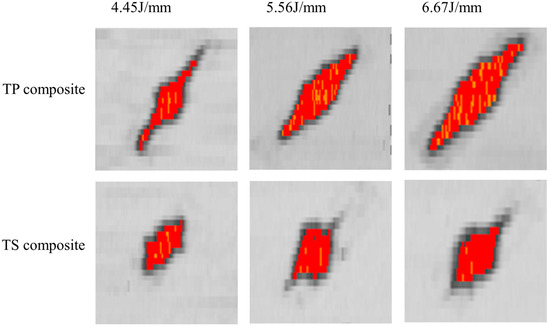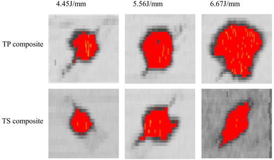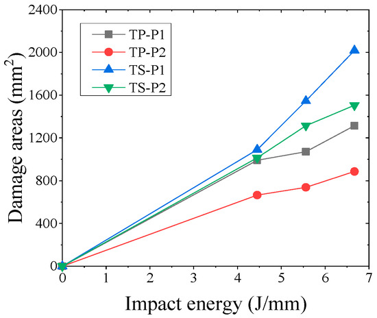 A comparison of the damage area of TP and TS composites for different fiber stacking sequences at impact energies of 4.45 J/mm, 5.56 J/mm, and 6.67 J/mm is shown in Figure 16. The variation curves of impact energy and the damage area of TP and TS composites for different fiber stacking sequences are shown in Figure 17. It can be seen from the figure that for TP composites, the damage area of all composites gradually increases with the increase in impact energy. For the impact energies of 4.45 J/mm, 5.56 J/mm, and 6.67 J/mm, the damage areas of the thermoplastic composites compared to the thermoset composites were reduced by 9.1%, 30.7%, and 34.9%, respectively, for the P1 lamination, whereas for the P2 lamination, the damage areas of the thermoplastic composites compared to the thermoset composites were reduced by 34.4%, 43.9%, and 41.4%, respectively. At an impact energy of 4.45 J/mm, the damage area of the P1 ply increased by about 30% compared to the P2 ply for thermoset composites, while the damage area of the P1 ply increased by about 7% compared to the P2 ply for thermoplastic composites. The main reason for this is that the thickness of the P1 composite is greater, the proportion of 0° plies is higher, and the stiffness is also greater; the impact force when the punch contacts the laminate is greater and the delamination damage area caused by the impact force is also greater, and the increase is more obvious for thermoset composites than for thermoplastic composites.
