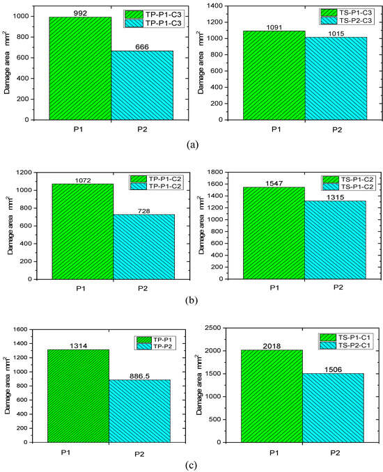 The comparison of damage area at different impact energies. (a) 4.45 J/mm impact energy; (b) 5.56 J/mm impact energy; (c) 6.67 J/mm impact energy.