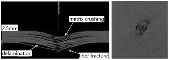 In order to further understand the internal micro-damage of the specimens after impact, the high-resolution CT detection system Y.CT MODULAR is used to conduct non-destructive CT scanning of the specimens after impact, that is, to conduct non-destructive CT scanning of the central section of the material after low speed impact through X-ray technology. Figure 18 shows the CT image of the P1 ply test piece under 6.67 J/mm impact energy. It can be clearly seen from the figure that the material in contact with the impact head is impacted to form an arc-shaped pit. The back of the test piece is bent and bulged, and the material in contact with the impact head has the phenomenon of matrix crushing. Under the impact load, there is obvious fiber fracture in the contact area of the punch, but there is more interlaminar delamination damage and fiber fracture at the impact back, and the delamination damage extends beyond the pit along the plane.