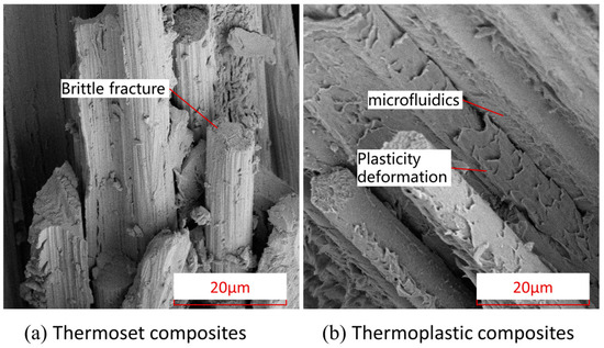 - Comparing the scanning electron microscope SEM results of thermoplastic composites and thermoset composites, it was found that, compared with thermoset composites, the thermoplastic composite had significant matrix plastic deformation at the fiber/matrix interface junction, and relatively small fiber-resin interface shedding. There was also a microfluidic phenomenon of plastic deformation in the TP matrix that showed obvious ductile fracture characteristics, while most of the fracture regions of the TS matrix were edge flake fractures; brittle fracture characteristics are obvious. It is this toughness characteristic of thermoplastic composites that gives them good impact resistance.