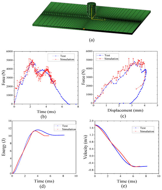 Comparison of simulation and tests of P2 laminated TP composites at 4.45 J/mm impact. (a) Simulation model; (b) Impact force–time curve; (c) Impact force–displacement curve; (d) Impact energy–time curve; (e) Velocity–time curve.