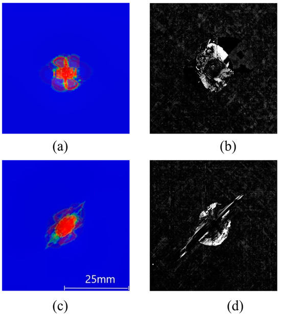 In order to better understand the internal delamination and matrix cracking damage of the test piece after impact, the damaged area of the test piece after impact is scanned by C-scan, and the scanning results are compared with the damage SDEG of the adhesive layer unit obtained by numerical analysis. Since the C-scan results are the superposition of the damage area projections of all layers in the actual impact, the superposition results of all adhesive layer units are selected when taking the finite element results. Figure 22 shows the delamination comparison of simulation and tests of TP composites at a 4.45 J/mm impact. Figure 22a,b show the delamination comparison of the simulation result and C-scan result for the P1 scheme. Figure 22c,d show the delamination comparison of the simulation result and C-scan result for the P2 scheme. It can be seen that the calculation model is relatively accurate in simulating the damage of matrix cracking and delamination.