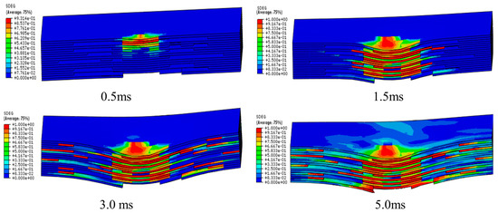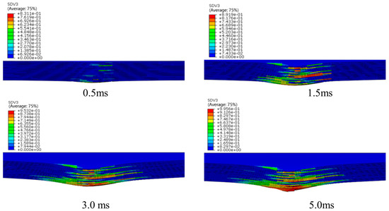 In the process of low velocity impact, the main damage forms are matrix cracks, delamination, fiber fractures, etc. Matrix cracks and interlamination damage occur first. Generally, composite laminates appear as matrix damage first at 2 J–4 J. Figure 23 shows the stiffness degradation (SDEG) of the interlamination at different times. The initial damage in the interlamination occurs at 0.5 ms. The damage is mainly located on the upper surface in contact with the impact head. As the impact head moves down, the laminate is punched out of the pit. The lower surface of the laminate in the impacted area is severely strained, so the interlamination cracks seriously on the lower surface.
