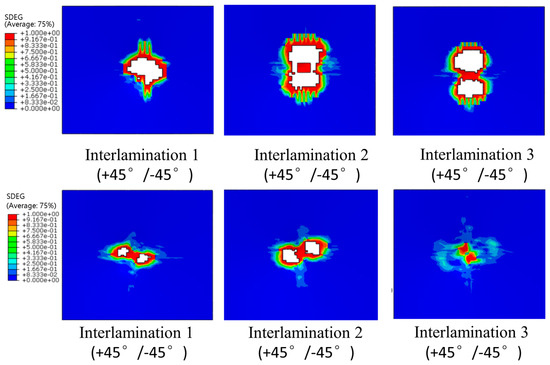 In the P2 scheme, interlamination 1 is closest to the lower surface, and interlamination 19 is closest to the upper surface (impact surface). Figure 24 shows the SDEG under an impact energy of 4.45 J/mm. It can be seen from the figure that the delaminated area near the lower surface is relatively large. On the contrary, the damaged area near the impact surface is relatively small. This is mainly because the bend deformation is larger in the lower surface, thus the bending stress is serious and the delaminated area becomes larger. On the one hand, the matrix cracks expand faster in the fiber direction than perpendicular to the fiber direction. On the other hand, the cracks will expand rapidly along the thickness direction. Furthermore, if the fiber direction of the adjacent layer is in a different orientation, the matrix crack will be blocked, and it will expand in interlamination to form delaminations.