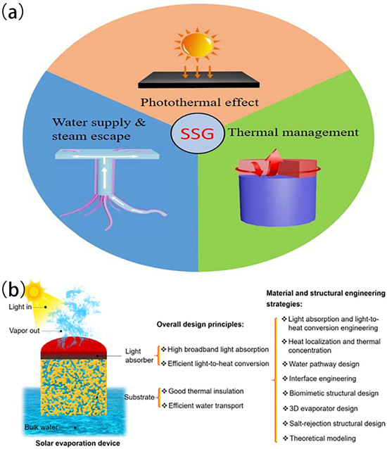 (a) The fundamental principles underlying the heat and mass transfer mechanisms within ISSG device. Reproduced from ref. [68], copyright 2018, Elsevier. (b) The design for assessing SSG capability. Reproduced from ref. [57], copyright 2018, Frontiers Media S.A.