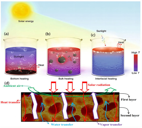 Solar steam systems can be categorized into three distinct heating methods, namely, bottom heating, bulk heating, and interfacial heating, based on the placing of the photothermal substance (Figure 2a–c). The process of bottom heating involves the transformation of solar energy into thermal energy, which is then utilized to immobilize active components at the lower region of a water body. Using this approach causes the application of heat to a significant portion of the aqueous environment. The process of bulk heating involves evenly dispersing plasma nanoparticles, which serve as the photothermal material, across the water body to achieve bulk heating. Interfacial heating refers to placing a photothermal substance at the interface between the air and water, resulting in the concentration of light only on a narrow layer of water on the evaporation surface [62].