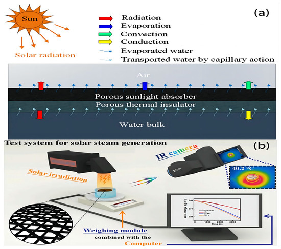 ISSG can effectively harness solar energy to heat the liquid that is located at the interface between the water and air, hence facilitating the formation of steam. Photothermal materials are capable of absorbing and converting solar radiation into heat energy [54]. However, photothermal materials typically have high light absorption properties across a broad spectrum, including visible and near-infrared wavelengths. When exposed to sunlight, the photothermal materials absorb photons and convert them into thermal energy [47]. In order to enhance the effectiveness of interfacial evaporation, inorganic and organic absorbers and photothermal materials, such semiconductor nanomaterials [8,51,55], plasmonic nanoparticles [56], metallic nanoparticles [57], Mxene [58], carbon derivatives [50] such as carbon black [17,29,30,41,53], activated carbon [48], carbon nanotubes [37], carbon fibers [59], and grapheme oxide [22], have been suggested as potential candidates for converting sunlight into heat; in fact, most of these absorbers have been coupled with floating structures of ISSG devices. Among these materials, carbon-based materials exhibit favorable photo stability across a broad spectrum of wavelengths, ranging from 200 to 2500 nm. Additionally, they possess exceptional chemical resistance, rendering them resistant to acidic, alkaline, and saline solutions. Furthermore, their flexible construction capabilities make them desirable for effective solar-driven evaporation applications [60]. The optimization of the solar–vapor conversion performance of an ISSG system requires meeting specific criteria, overarching principles, unique material requirements, and design characteristics, as illustrated in Figure 1a,b. These principles encompass (i) the ability to effectively absorb solar light across a wide range of wavelengths, (ii) the localization of heat at the interface between the air and water, (iii) a sufficient supply of water to sustain continuous evaporation, (iv) the presence of suitable pores that facilitate the avoidance of vapor, and (v) good thermal management properties [21,25].