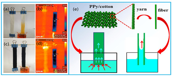 The optical images illustrating the vascular absorption of water by pristine cotton (a) and PPy/cotton. (c) IR photos demonstrate the temperature variations in pristine cotton (b) and PPy/cotton, (d) both before and after capillary absorption. (e) The process of capillary water absorption in PPy/cotton fabric. Reproduced from ref. [72], copyright 2018, Elsevier.
