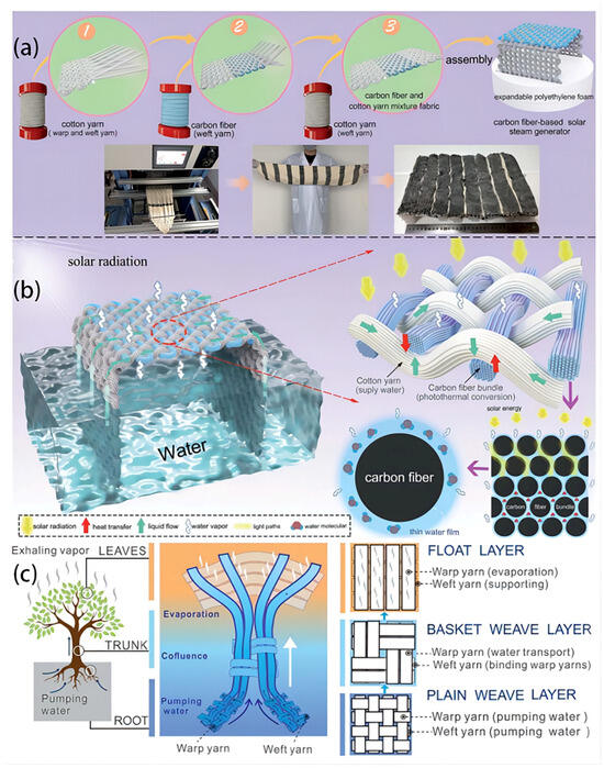 Woven technology is usually applied to produce woven fabrics through the systematic interlacing of warp and weft threads, resulting in fabrics that exhibit favorable attributes such as a high tensile strength, resilience to wear and tear, dimensional stability, and a dense structure [54]. Textile products possess a modifiable structure and contain micronized pores, enabling the effortless cleansing of filthy garments. Additionally, these fabrics exhibit commendable longevity, facilitating the effective elimination of impurities [79]. However, cotton has become known as the primary natural fiber being utilized in the textile industry due to its inherent characteristics such as natural softness, significant hygroscopicity, exceptional wear comfort, and skin-friendly properties [80]. By employing a practical textile weaving method, Zhang Q. et al. [75] presented an ISSG device composed of a blend of carbon fiber and cotton yarn (Figure 5a,b). This device has remarkable capabilities in generating solar steam, owing to the carbon fiber’s reliable and efficient light-absorbing properties, as well as the unique structure of the fabric. The manipulation of the woven fabric’s design can control the levels of light absorption and amount of water within the cloth. Under 1 unit of sun light, the modified fabric demonstrates a notable efficiency rate of 1.87 kg m−2 h−1 and evaporation efficiency of 83.7%. An all-encompassing and expansive apparatus, equipped with anti-salt clogging capabilities, may be readily achieved through the manipulation of the warp thread count and weft thread width. The constructed fabric exhibits considerable promise in the realm of obtaining cost-effective purification of seawater and other forms of wastewater. Consequently, it offers a novel avenue for the advancement of solar interfacial evaporators that are characterized by their high efficiency, scalability, and stability.