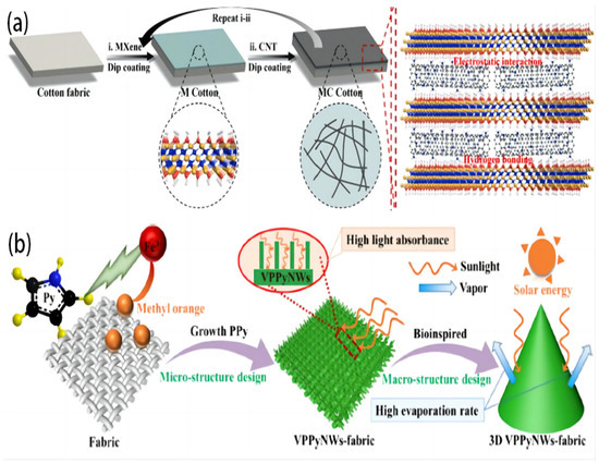 A composite fabric combines two or more fibers or materials to create a single fabric with improved qualities. The blended fabric’s combination of materials enables the effective utilization of each component’s capabilities, leading to a fabric that exhibits enhanced performance qualities. Wang Y. et al. [58] constructed a novel composite material of MXene, carbon nanotubes, and cotton fabric using a layer-by-layer assembly technique (Figure 6a). This fabrication aimed to develop a material that is capable of ISSG for purifying textile effluent. The device significantly enhanced the optical absorption, light-to-thermal conversion, and water transport capabilities due to its significant interfacial contacts. Under 1 solar illumination, the evaporation rate for pure water was 1.35 kg m−2 h−1, while for textile wastewater, it exceeded 1.16 kg m−2 h−1, with an evaporation efficiency of 88.2%. These values are higher than those observed in prior research on fabric-based composites. Reducing the number of organic–inorganic pollutants in condensed fresh water is a crucial aspect that is often overlooked but holds significant importance in practical applications. In addition, the reusability test and outdoor experiment were conducted to showcase the practical application of the photothermal features. Furthermore, the findings of this study indicate that the composite material possesses superior performance and durability, as well as a straightforward fabrication procedure.