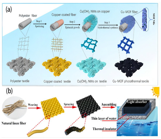 Hydrophilic fabrics are designed to quickly wick away moisture from the skin, spreading it across a larger surface area to enhance evaporation and promote a dry and comfortable feeling. A highly hydrophilic, linear, and durable copper-based metal–organic framework (Cu-MOF) was designed by Wang J. et al. [82]. An absorber coating was securely attached to the surface of a commercially available textile material through the utilization of a sputtered copper film as a bonding layer (Figure 7a). However, the Cu-MOF photothermal fabric based demonstrated effective prevention of salt formation on its upper surface, even when exposed to a salinity of 9.5 wt% for over 12 h during evaporation. This can be attributed to the CMPT’s exceptional capillary effect and strong water-pumping performance. The CMPT, characterized by its exceptional light absorbance (95.9%) resulting from the distinctive hierarchical structure of Cu-MOF that enhances light trapping and its excellent air permeability, demonstrated a significant evaporation rate of 1.52 kg m−2 h−1 under 1 solar irradiation. The CMPT has a remarkable structural design, resulting in a high degree of adaptability, exceptional mechanical strength, and superb chemical stability, even in demanding conditions. The study introduces an easy and uncomplicated method for surface immobilization of MOF coatings on textile fibers. This method has potential practical applications in the development of portable solar steam generators. In another study conducted by Song L. et al. [31], an innovative method was used for developing an effective ISSG using a linen fabric with candle soot (Figure 7b). The system combines broadband light absorption, super-hydrophilicity, and an exceptional transition layer of water between a solar evaporator and an insulating material. This design aims to optimize the temperature control and water supply synergistically. By integrating improved energy management techniques and ensuring an ample water supply, the developed ISSG demonstrates a commendable evaporation rate of 1.44 kg m−2 h−1 and a high efficiency of conversion. The solar irradiation of 1 sun irradiation resulted in a solar-to-thermal conversion efficiency above 90% in salt water with a concentration of 20 wt%. The study has the potential to introduce a novel and straightforward approach to the water purification field.