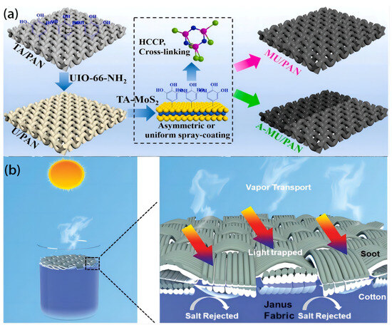 (a) Fabrication process of MU/PAN fabric. Reproduced from ref. [83], copyright 2021, Elsevier. (b) Design of the soot-deposited Janus fabric floating on the water surface. Reproduced from ref. [84], copyright 2019, WILEY.