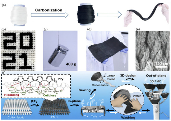 (a) Photos of Bombyx mori (B. mori) silks before and after the carbonization; (b) “2021” is knitted by carbonized B. mori silks (CBSs); (c) a load of 400 g is lifted by CBSs (0.1 g); (d) a fabric is made of CBSs and cotton yarns; (e) the SEM image of a composite fabric. Reproduced from ref. [87], copyright 2021, Fronitiers. (f) Fabrication of functionalized cotton fabric as 2D/3D SSG. Reproduced from ref. [88], copyright 2019, Elsevier.