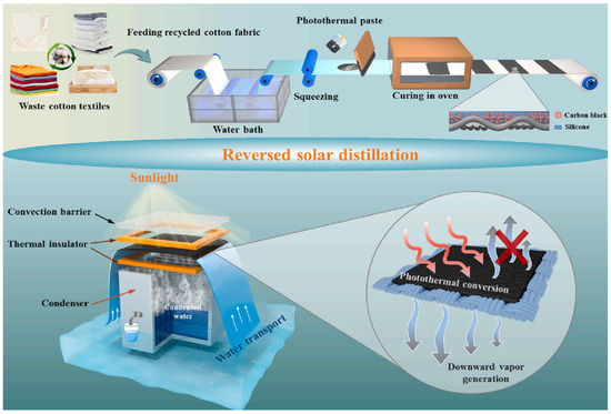 A novel approach to boost freshwater production by integrating a Janus fabric with thorough thermal control in a reversed ISSG was developed by Gao C. et al. [91]. An inexpensive Janus fabric, which incorporates recycled cotton fabric, was manufactured by applying a layer of carbon black@silicone on the top side using a straightforward and flexible pre-wet coating technique (Figure 12). The Janus fabric possesses effective sealing capabilities that contribute significantly to the prevention of upward vapor formation, hence minimizing optical loss. Consequently, these characteristics of the Janus fabric contribute to the enhanced collection of freshwater in the distillation process. The Janus fabric-based interfacial solar distiller demonstrates a high level of sunlight absorbance, measured at 98.0%, and remarkable performance, with a water production of 1.17 kg m−2 h−1 and an efficiency of 78% when exposed to one sun (1 kW m−2) illumination. The study introduces an innovative design for a high-performance interfacial solar distillation system, which has the capability to be implemented on a large scale and at an affordable rate for industrial production purposes.