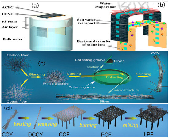 (a) The design of the SSG system. (b) The transportation routes of water and salt on ACFC and CFNF in ISSG. Reproduced from ref. [71], copyright 2019, American Chemical Society. (c) The blending and spinning process of carbon–cotton yarn (CCY). (d) The production process of the LPF using the CCY. Reproduced from ref. [73], copyright 2022, Wiley.