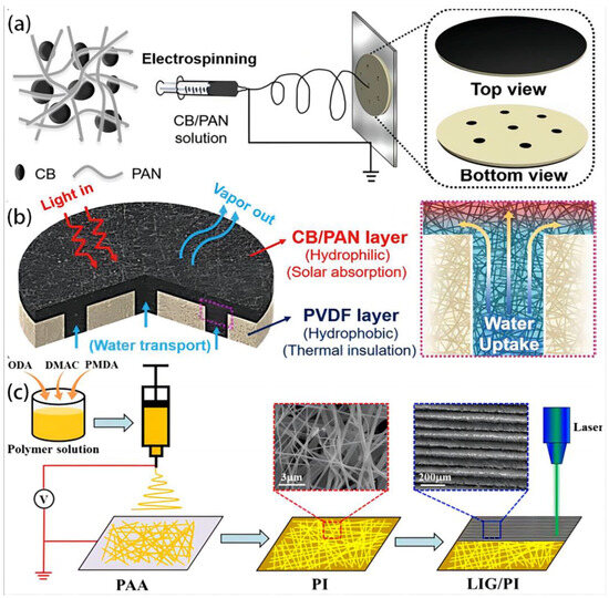 (a) The fabrication process and structure of the bilayer SSG device using an electrospinning method. (b) The X-section of hydrophilic CB/PAN and hydrophobic holey PVDF layers. Reproduced from ref. [97], copyright 2018, WILEY. (c) The design process of PI membrane and LIG/PI membrane. Reproduced from ref. [60], copyright 2020, American Chemical Society.