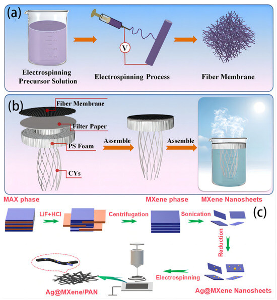 (a) The fabrication of (a) electrospinning fiber membranes and assembly of (b) interfacial water evaporator. Reproduced from ref. [99], copyright 2020, Elsevier. (c) The diagram of the design of Ag@MXene/PAN nanofiber membrane. Reproduced from ref. [98], copyright 2021, Elsevier.