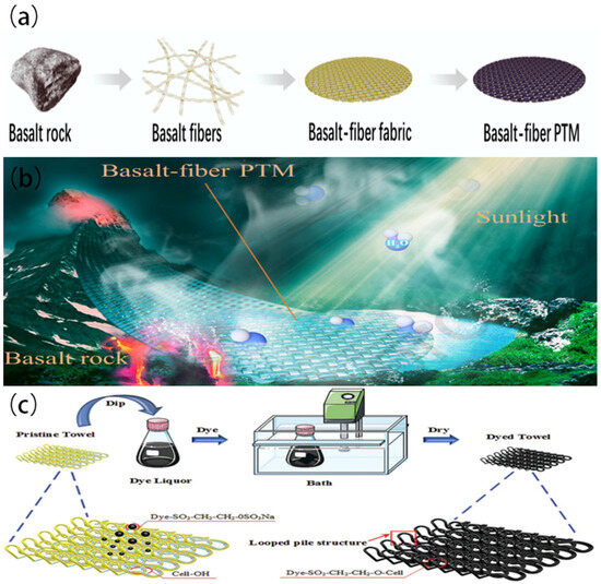 (a) A diagram depicting the procedure for the fabrication of the basalt fiber (PTM). (b) The design of the basalt fiber PTM in photothermal evaporation system. Reproduced from ref. [103], copyright 2021, Elsevier. (c) Diagram of the dyeing steps. Reproduced from ref. [8], copyright 2019, WILEY.