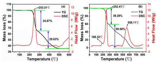 The study of the thermal decomposition of GAP elastomers is necessary to understand and analyze their thermally accelerated aging mechanism. By revealing the key reactions and products in the thermal decomposition process, we can gain insight into the causes and mechanisms of aging elastomers. Firstly, the thermal decomposition process of unaged GAP elastomers under different atmospheres was investigated by TG-DSC (Figure 2).