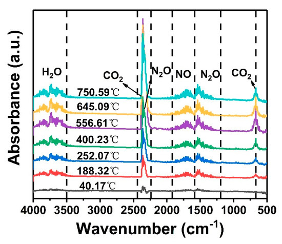 The main gaseous products of the thermal decomposition of GAP elastomers are N2O, NO, H2O, and CO2. The absorption peaks at 2270~2470 cm−1 and 550~760 cm−1 are related to CO2, while the absorption peaks at 2150~2270 cm−1 and 1400~1570 cm−1 are related to N2O [25]. In the initial stage of thermal decomposition (before 252 °C), the growth rate of NO and N2O gases was fast. With the increase in temperature, the absorption peaks of the gaseous products gradually increased, especially the absorption intensity of CO2. The absorbance of CO2 reached its maximum at 556.61 °C, and then the intensity decreased. This indicated that the GAP elastomer first cracked its azide groups in the air atmosphere. Although the molecular chain also began to depolymerize, the decomposition lagged slightly behind the breaking off of the -N3 groups [27]. With the increase in temperature, the GAP skeleton was oxidized and decomposed until it was complete [28].