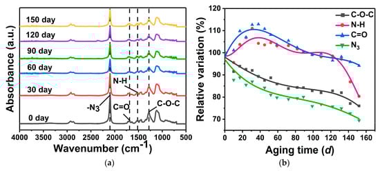 Changes in functional groups of the GAP elastomer with different aging times: (a) FTIR spectroscopic results; (b) Changes in the relative content of characteristic functional groups.