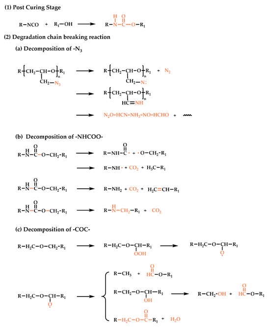 As the crosslinking points of the GAP bonding system, -NHCOO groups can react reversibly to form isocyanates and hydroxyl groups during aging. Secondly, the C-O bonds in the urethane groups are also easy to break, forming aminoformyl radicals and alkoxy radicals, and bonding with H on the β carbon to form carbamates; however, carbamates are unstable and continue to decompose into primary amines. At the same time, the C-O bonds connected to the carbamate also break, and the broken groups combine with -NH to form CO2 and secondary amines [30].