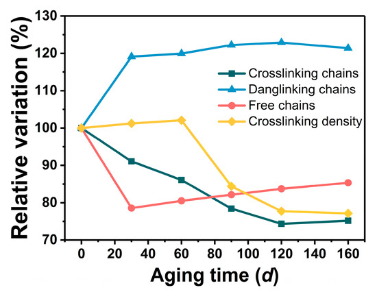 For the process of thermal aging, the proportion changes in the three molecular chains are shown in Figure 6. The percentage of crosslinked chains (Pc) in the unaged GAP elastomer that could effectively provide mechanical properties was relatively low (<25%), and most of it existed in the form of dangling chains (Pd). During the aging process, the proportion of Pc decreased gradually, while the proportion of free chains (Pf) decreased sharply and then increased slowly, and the proportion of Pd increased gradually. The change in crosslinking density showed a trend of increasing and then decreasing, and after 160 d of aging, the proportion of Pc had decreased by about 24.82%, the proportion of Pf had decreased by about 14.67%, and the proportion of Pd had increased by about 21.38%.