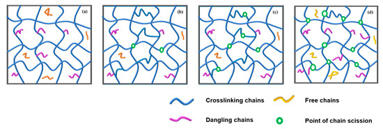 During the aging process, the chemical-structure changes in the elastomers are mainly post-curing and degradation chain breaks. The chemical reaction is analyzed as follows, and the reactions that occur are summarized in Figure 5: